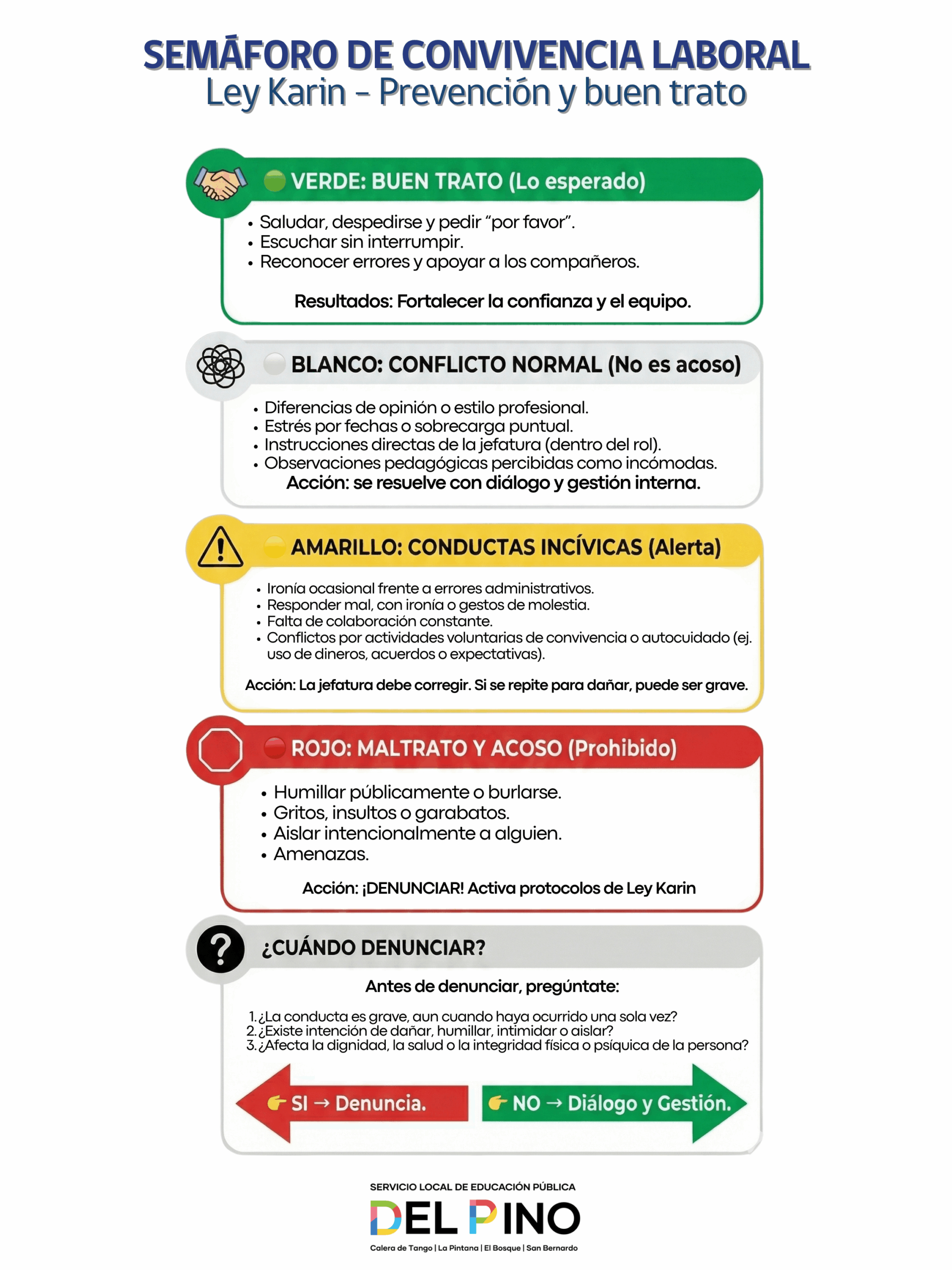 - Cobertura universal y objetivo: El protocolo rige para todo el personal del SLEP Del Pino y busca proteger la dignidad en el trabajo.