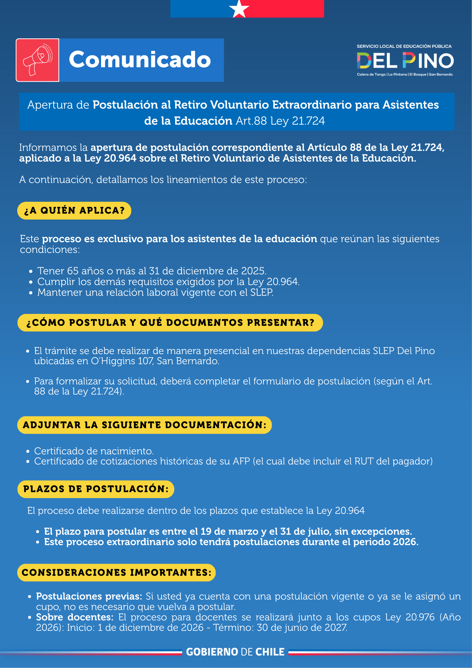 El SLEP Del Pino informa el inicio del proceso de postulación al Retiro Voluntario Extraordinario (Art. 88 Ley 21.724). Este trámite es exclusivo para asistentes de la educación que tengan 65 años o más al 31 de diciembre de 2025 y mantengan contrato vigente.
